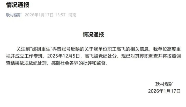 1月17日,涉事男子所在企业发布情况通报:关注到“娜姐重生”账号反映的关于我单位职工高某的相关信息,我单位高度重视并成立工作专班。2025年12月5日,高某受到党纪处分。现已对其停职调查并将按照调查结果依规依纪处理。