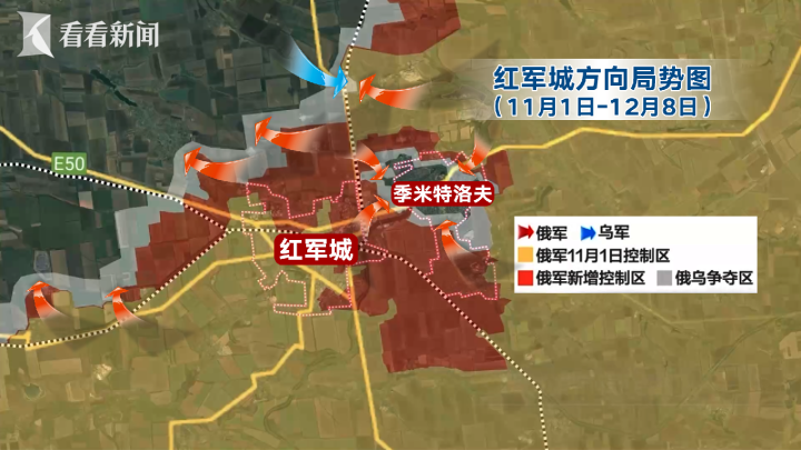 目前,俄军正以冲突爆发以来最快速度推进,乌方在11月失去的领土面积是10月的两倍。在顿巴斯方向,俄军已完成对季米特洛夫等关键据点的合围,并在谢韦尔斯克等地突破乌军防线。